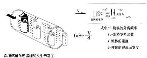 渦街流量傳感器是以卡門(Kaman)和斯特勞哈(Strouhsl)有關旋渦的產生和旋渦與流速關系的理論來測量流量的。當介質以一定速度流過三角柱體時,在三角柱體兩側后面產生一個交替排列的旋渦帶,稱之為“卡門渦街”(見下圖)。