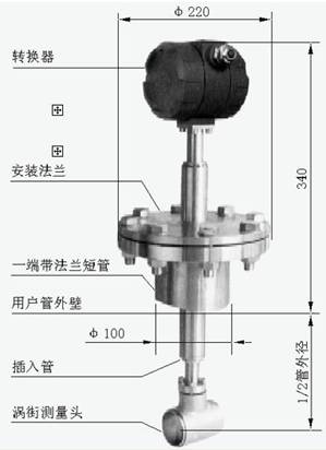 將渦街測量頭插入管道特定位置,通過測量該位置的局部流量,根據管道截面流速分布關系,計算出管道內平均流速值。它由轉換器、插入桿組件、球閥(根據需求配 )、安裝短管(ф100)、渦街測量頭等組成。