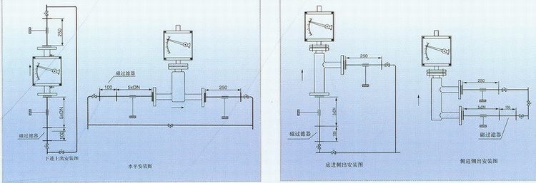 流量計應(yīng)垂直安裝,流量計中心線與鉛垂線的夾角不超過5°。在累計的上游須保證五倍公稱通徑的入口直管段,下游保證250mm出口直管段。如果介質(zhì)中含有固定雜質(zhì),應(yīng)在流量計上游加裝過濾器,如果介質(zhì)中含有鐵磁性物質(zhì),應(yīng)在流量計的上游安裝磁過濾器。為了便于維護和清洗且不影響,建議安裝旁通管路。