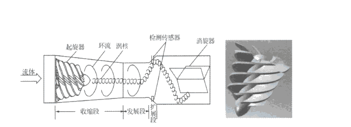 在流量計入口處裝有螺旋形導(dǎo)流葉片,流體進(jìn)入后會產(chǎn)生激烈的螺旋旋轉(zhuǎn),進(jìn)入擴(kuò)散腔后流體會發(fā)生二次旋轉(zhuǎn),氣體旋轉(zhuǎn)后撞擊流量計內(nèi)壁產(chǎn)生振動頻率,振動頻率是和流量成正比的。當(dāng)流量計設(shè)計得當(dāng)時,在很寬的流量范圍內(nèi),旋渦的頻率與流量成線性關(guān)系,該頻率由壓電傳感器檢測,由流量積算儀進(jìn)行運算和處理,可以輸出4~20mA信號。